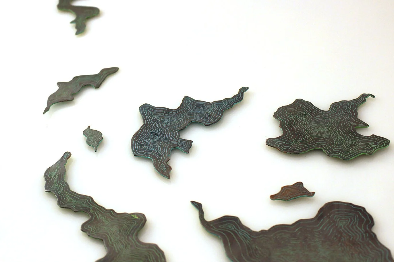 Etched & pierced copper, spray paint, patina